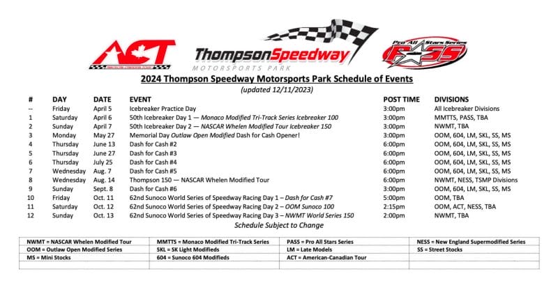 Source : racedayct.comThompson Speedway Set for Expanded 12 Event Schedule in 2024