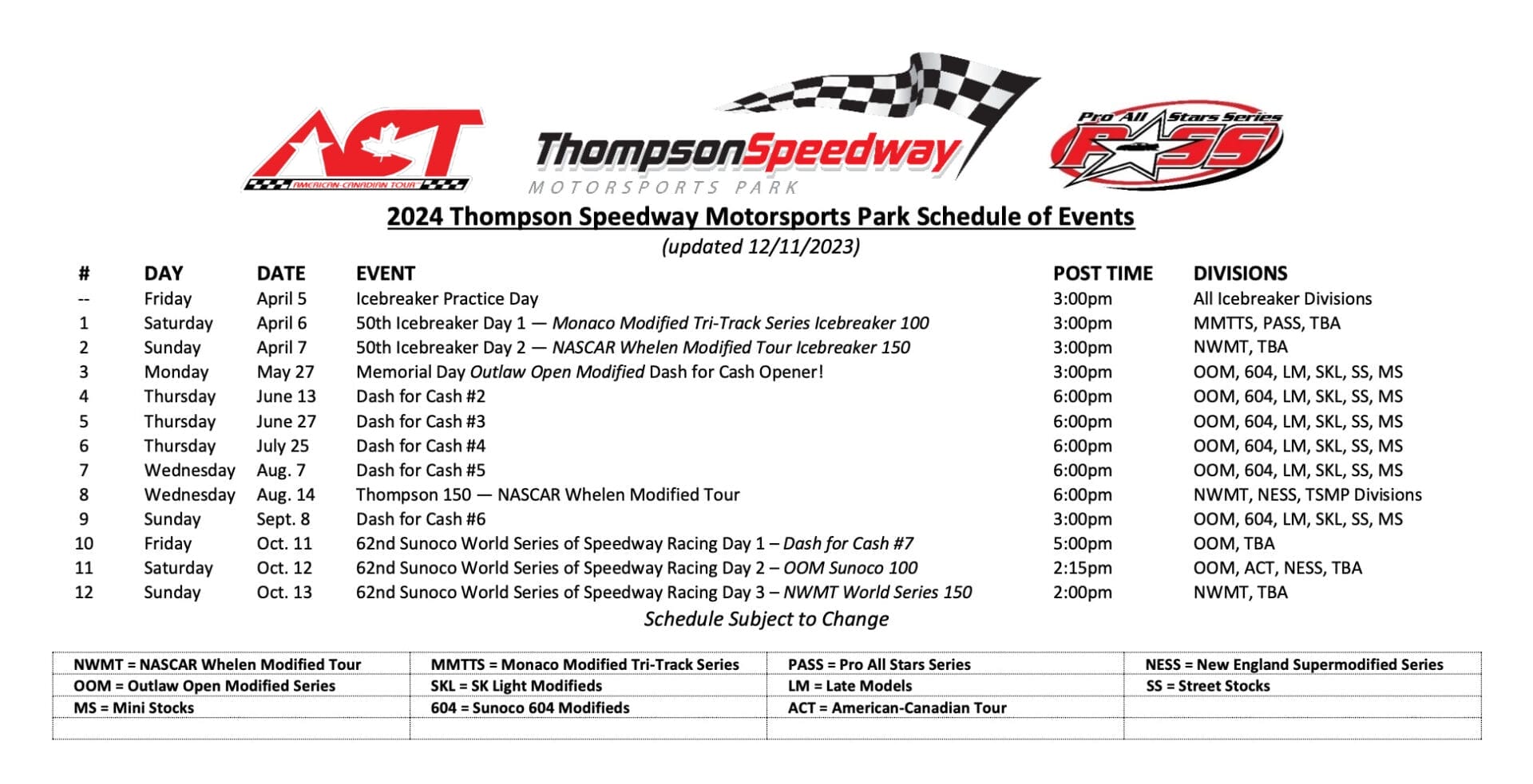 Source : racedayct.comThompson Speedway Set for Expanded 12 Event Schedule in 2024